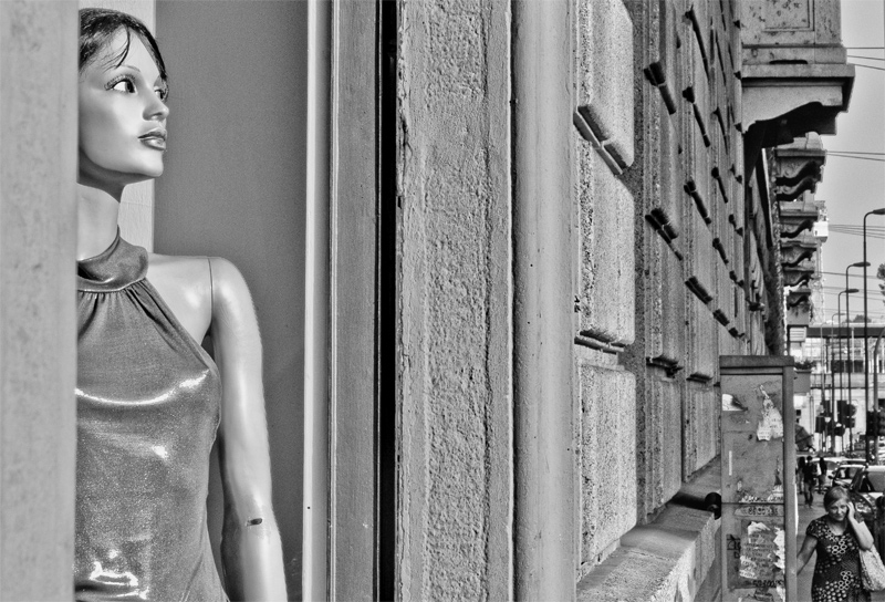 A me piace molto, trovo corretto il taglio di manichino e donna che escludendo eventuali elementi di disturbo, porta l'interesse sullo sguardo verso l'alto del manichino.