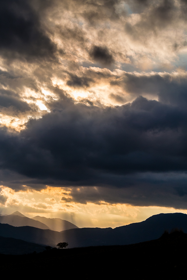 Buono il momento colto con il raggio di luce che illumina l'alberello. La composizione con una netta predominaza del cielo da cui parte il raggio ci sta. Avrei comunque provato anche uno scatto con un mezzo tele per focalizzare di più l'attenzione sull'albero, sul raggio e sul profilo delle montagne sulla sinistra, dando meno spazio al cielo.