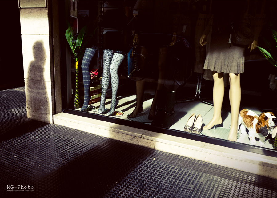 Dove è la realtà? Ombre umane, manichini, cani di pezza....condensato in uno scatto la società contemporanea. Mi piace.