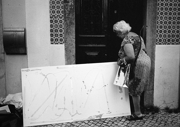 Con il colore delle mattonelle (bellissime) portoghesi e con il colore (i colori) della veste della donna avrei aggiunto, avrei aumentato le informazioni, gli oggetti da raccontare. Avrei però perso in efficacia...l'occhio avrebbe vagato nell'immagine, un po' qui, un po' qui, con poca "forza". Qui la foto ( magari banale) sta semplicemente tra il bianco del pannello ed il nero della porta buia. Nel mezzo una donna in grigio che vuole entrare...tutto qui.