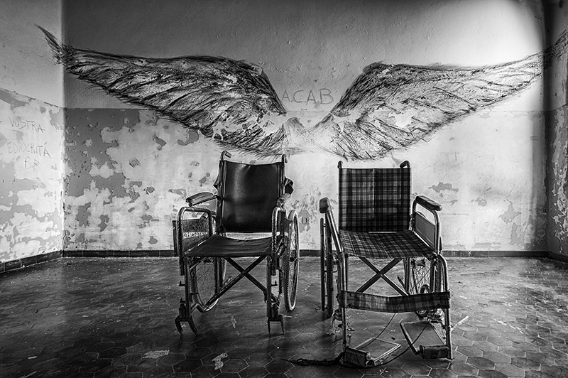 Gli altri tre scatti si muovono tra un resoconto della fatiscente struttura e tracce di vita appese alla parete....