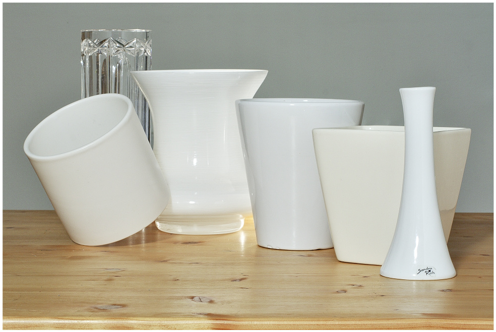 la luce, troppo cruda, guarda il vaso di vetro, stona sia come illuminazione che come oggetto in una scena che non gli appartiene, riprova solo con i vasi bianchi e una luce diffusa a 3/4 di lato, un pannello bianco per aprire le ombre e vedrai come cambia.