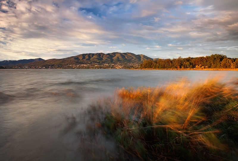 | Bello il mosso della vegetazione in primo piano che contrasta con il panorame sullo sfondo estremamente nitido e poi, bellissimi i colori e la luce colta. |