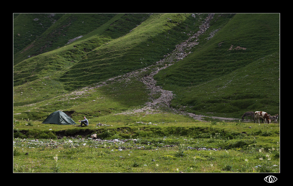 mi sembra un bello scorcio di vita di montagna che trasmette pace e tranquillità, anche se, effettivamente, il pastore sembra un campeggiatore. Lo scatto per i miei gusti ha un po' troppo piede: toglierei un paio di cm in basso che mi sembrano di troppo, fino ai piedi del rilievo dov'è montata la tenda.