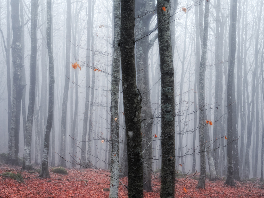 Foto dai forti connotati grafici dati dalla verticalità dei fusti e con una nota di mistero dato della nebbia che avvolge il bel bosco. Le poche foglie danno un bel accenno di colore.