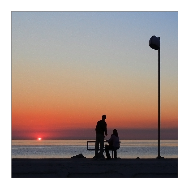 L'ho composta coi tre elementi fondamentali (sole, famiglia e lampione) che costringono lo sguardo a salire dal basso a sinistra verso l' alto a destra in un formato quadrato che enfatizza il senso di quiete e serenità. Almeno nelle mie intenzioni.