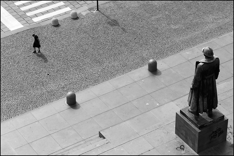 Molto bella per la disposizione dei vari elementi in gioco, con molteplici richiami ed intrecci geometrici; a questo si aggiunge la relazione statua/donna anziana ed un BN impeccabile. Una foto con tanti piani di lettura, pertanto aggiungo anche io i miei complimenti!
