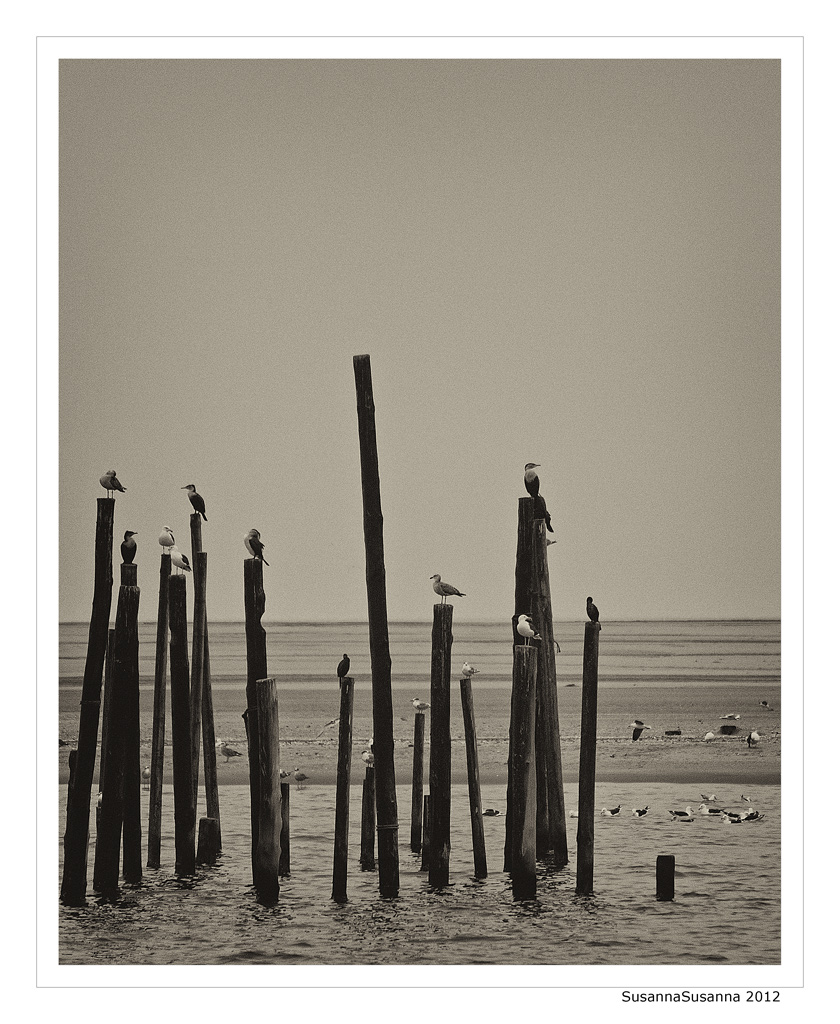 E' stata scattata da un barchino e mi aveva colpito, oltre alla caotica distribuzione dei pali, il fatto che gli uccelli sembravano aspettare ansiosamente il 'patriarca' sul palo più alto. La giornata era assolutamente grigia in effetti. Il taglio un po' brusco a sx è stato determinato dalla presenza di elementi di disturbo Triste ...