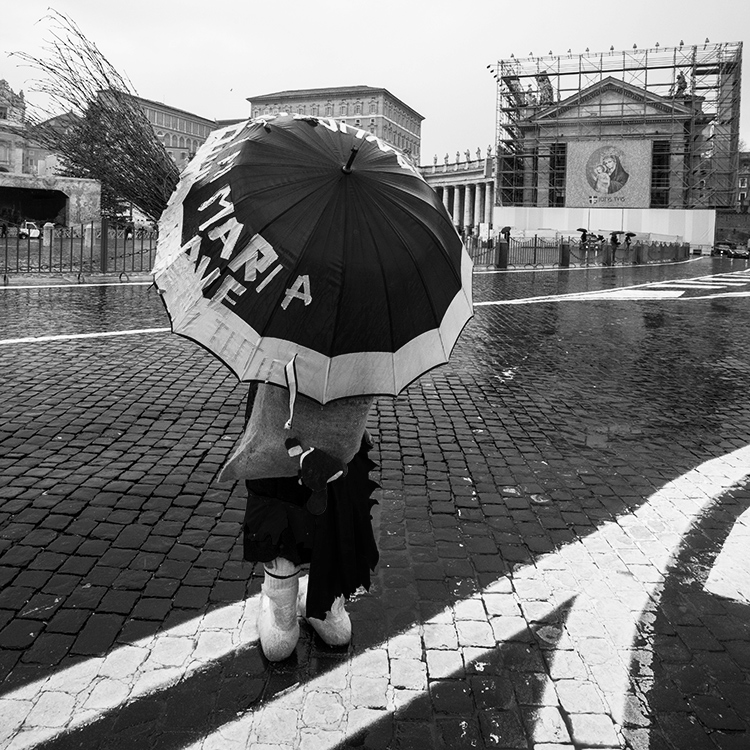 L'ho preferita in b/n perchè i colori sparati della donna con l'ombrello avrebbero annullato il mosaico della madonna sul colonnato.