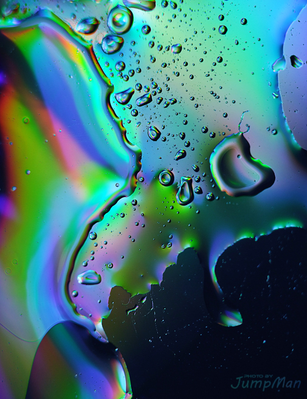 lastra di cristallo rialzata, acqua e olio sopra, 1 cd sotto, una lampada a led, cavalletto, macchina fotografica con lente macro.