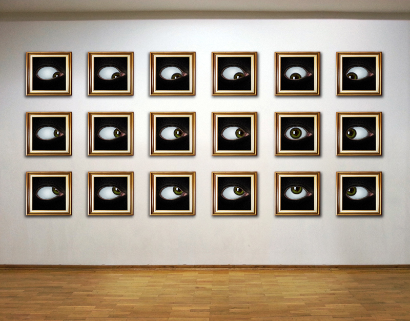 Inizialmente pensavo di utilizzare una coppia d'occhi per ogni cornice ma facendo delle prove ho constatato che un solo occhio all'interno di ogni quadro risulta graficamente più d'impatto.