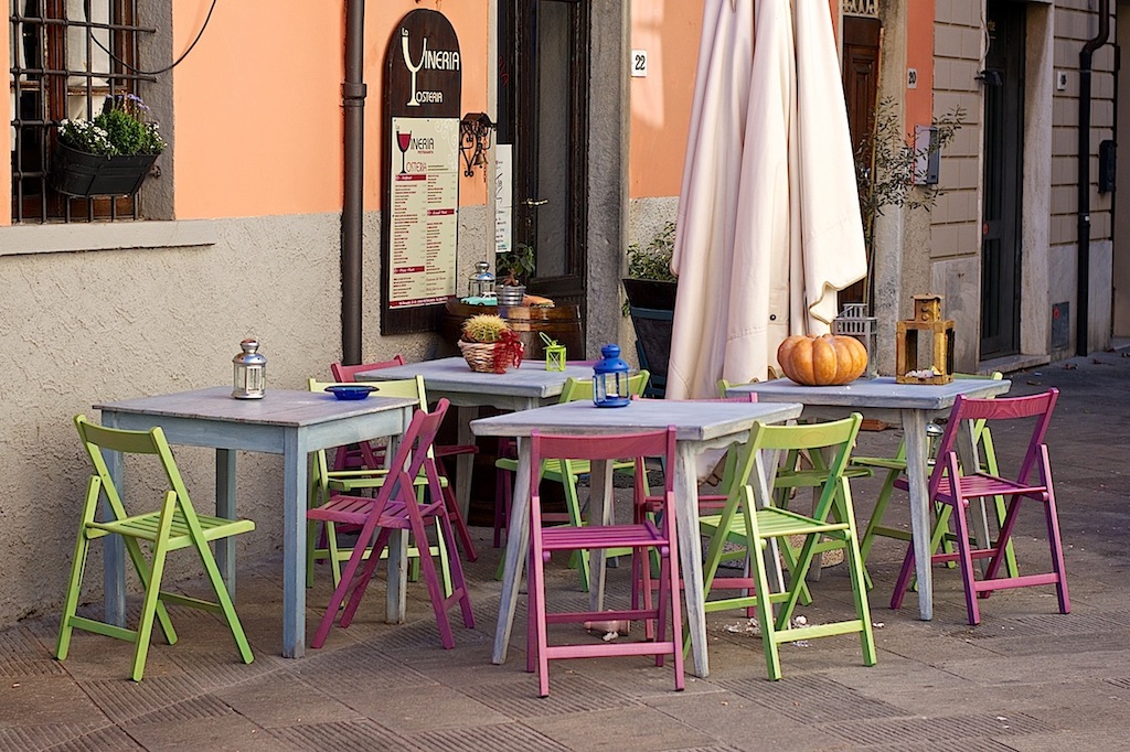 Il soggetto "giusto" per stuzzicare l'occhio del fotografo (e poi dell'osservatore) c'è: quel piacevolmente disordinato assembramento di sedie colorate (con annessa zucca) era lì per essere ripreso. Secondo me dovevi solo (anziché limitarti ad esporre correttamente, come hai fatto, per una situazione non difficile) trovare l'inquadratura o il momento "forte" per la ripresa. La prima poteva venir fuori abbassandoti e riprendendo per intero l'ombrellone qui scapitozzato (dato che anche questo fa parte della scena); l'altro poteva essere determinato dalla presenza in campo di un umano ben posizionato (in entrata o uscita, per esempio, dalla simpatica osteria).
