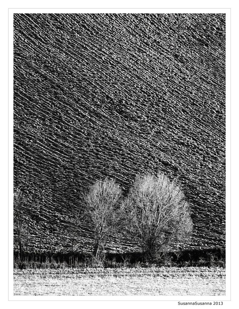 Che bella! La forza dell'alto contrasto e la grafica risultante ne fanno un'immagine interessante. La collina sullo sfondo, senza altri particolari di riferimento, sembra un muro verticale, uno sfondo naturale per i due alberi. Mi piace.