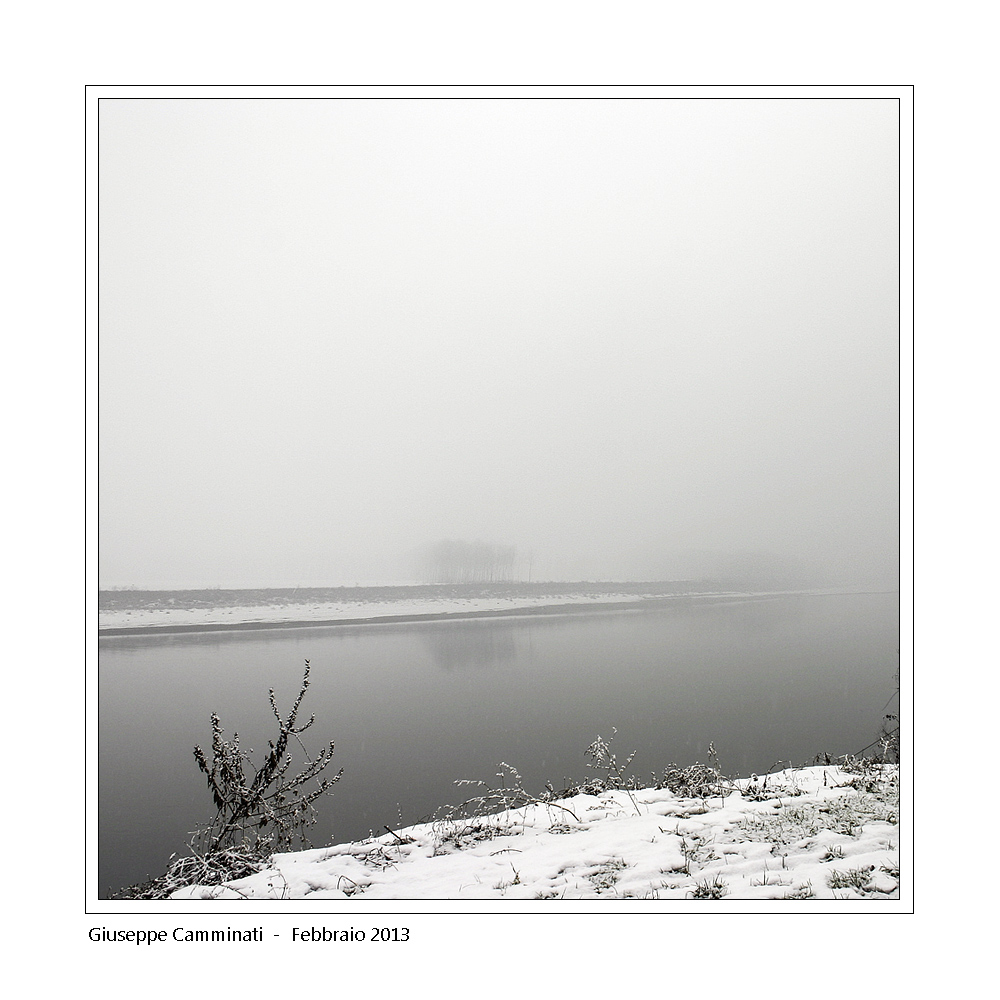 la poca visibilità e i toni tenui inducono a cercare di immaginare il paesaggio oltre la sponda. Mi colpiscono molto gli alberi sullo sfondo, quelli al centro dell'immagine.