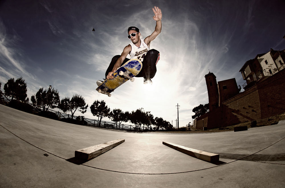 La distorsione aggiunge pathos alla dinamicità dell'azione e questo controluce + fill-in sono perfetti per immortalare lo skater...