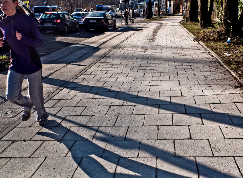 L'occhio si sbilancia verso la podista ma si trova disturbato pure da un panorama che non aiuta a decifrare lo scatto....