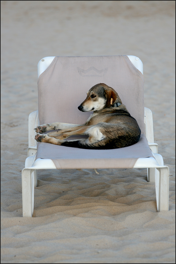 Nitida, netta e dominante , con la sua tonalità scura, la figura del cane in relax ,sulla chiarezza di sedia a sdraio e del substrato di sabbia; spicca protagonista. Creature speciali questi nostri amici: allegri, spontanei,e talvolta pieni di innata eleganza, come qui, persino in un qualsiasi attimo di quiete.