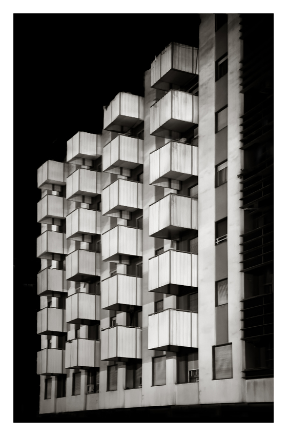 | Ci può stare, ma di primo acchito appare quasi come una struttura sospesa, mi manca il collegamento con il terreno (fosse pure un portico, come immagino). A livello compositivo e come punto di ripresa mi pare un po' troppo scontata. Mi piace invece la sequenza geometrica dei balconi, ed il b/n approntato. |