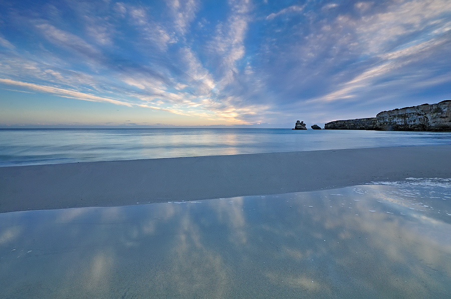 Bello questo "doppio cielo" diviso da un lembo di spiaggia. Un po' troppa MdC sulle rocce (bordo segnato).