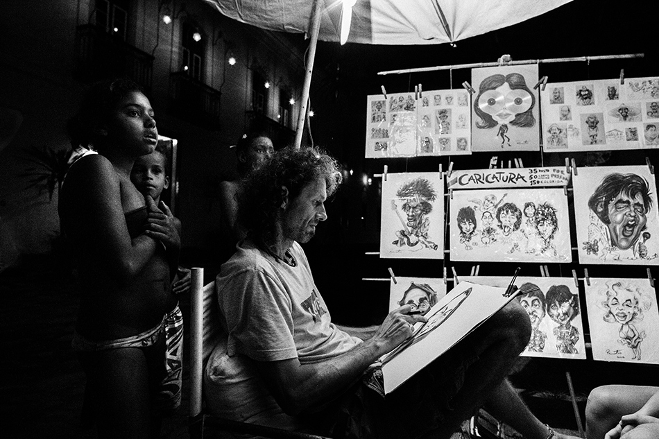Trovo che la composizione dia troppo spazio all'esposizione delle caricature: perché occupano effettivamente una grande porzione di fotogramma, perché "spiccano" avendo lo sfondo bianco e trovandosi nella zona maggiormente illuminata della scena, e poi perché le caricature, per definizione, non possono non attirare l'attenzione. Tutto ció fa sí che il vero soggetto e motivo dello scatto, le espressioni delle bambine dietro al disegnatore, non diventino il vero fulcro dell´immagine. Guardando la foto il mio occhio continua a spostarsi tra le caricature a dx e le bambine a sx, peraltro senza quasi soffermarsi sull'artista che sta in mezzo, che trovo sia un elemento piuttosto neutro nell'economia narrativa dello scatto.