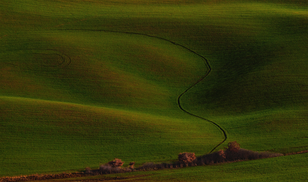 Un mare di verde terra con le sue ondulanti forme spennellate di luce. Molto bella Ok!