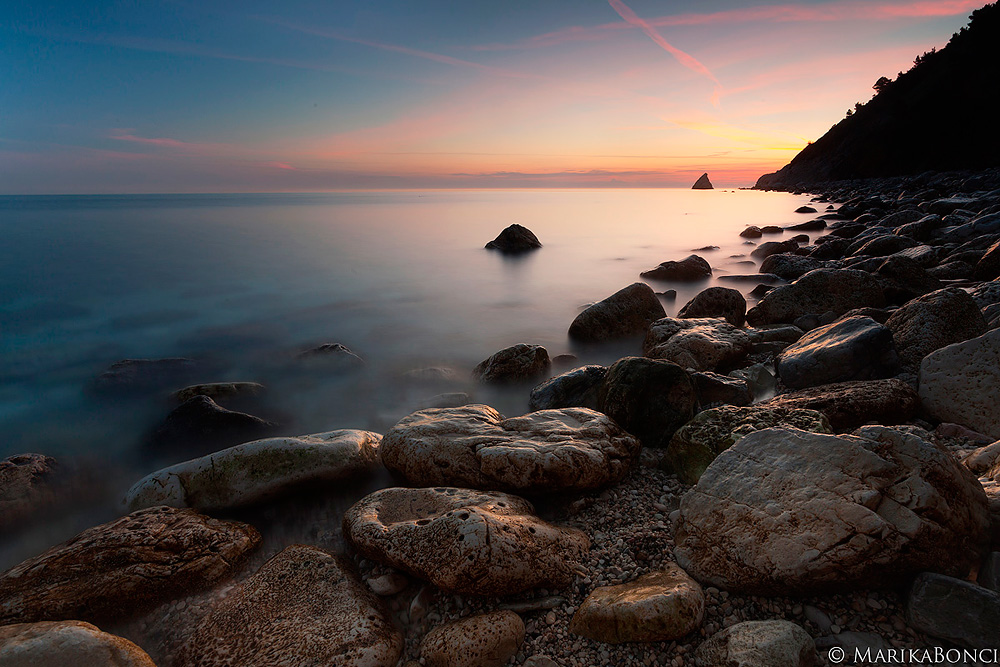 Gli scogli di Portonovo regalano spesso degli scatto eccellenti. Qui una bella luce rende vividi le rocce sulla sabbia in una miriade di colori nel cielo.