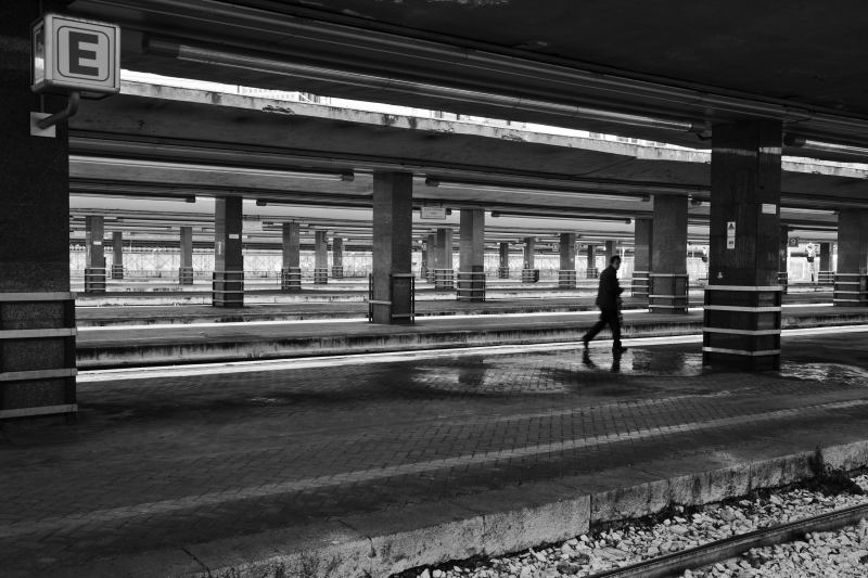 Mi piace quest'uomo che se ne va solitario per la stazione vuota.