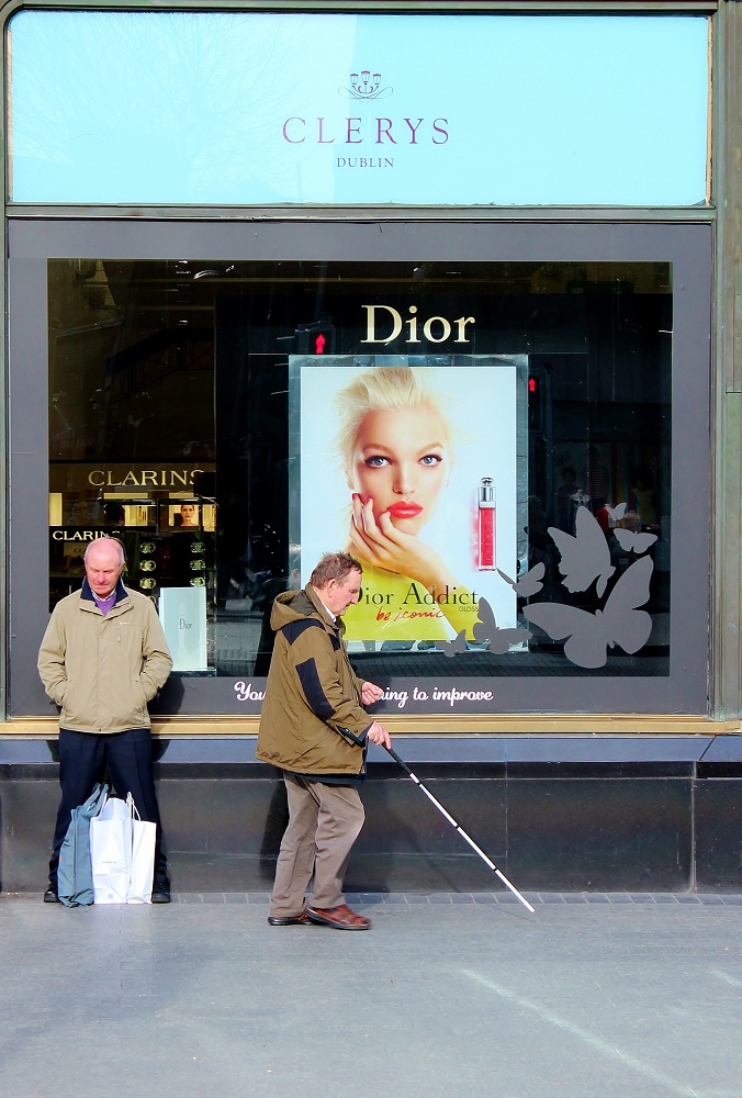 Tra i vari sinonimi di quel ''improve'' scritto sulla vetrina davanti al soggetto mi piace tradurla come migliorare, in parte lo è...il non vedente (credo, perlomeno dal bastone mi fa pensare a questo) che se va per la sua strada e l'altra figura, fermo in attesa di qualcuno o di qualcosa, trasmette un segnale di speranza.