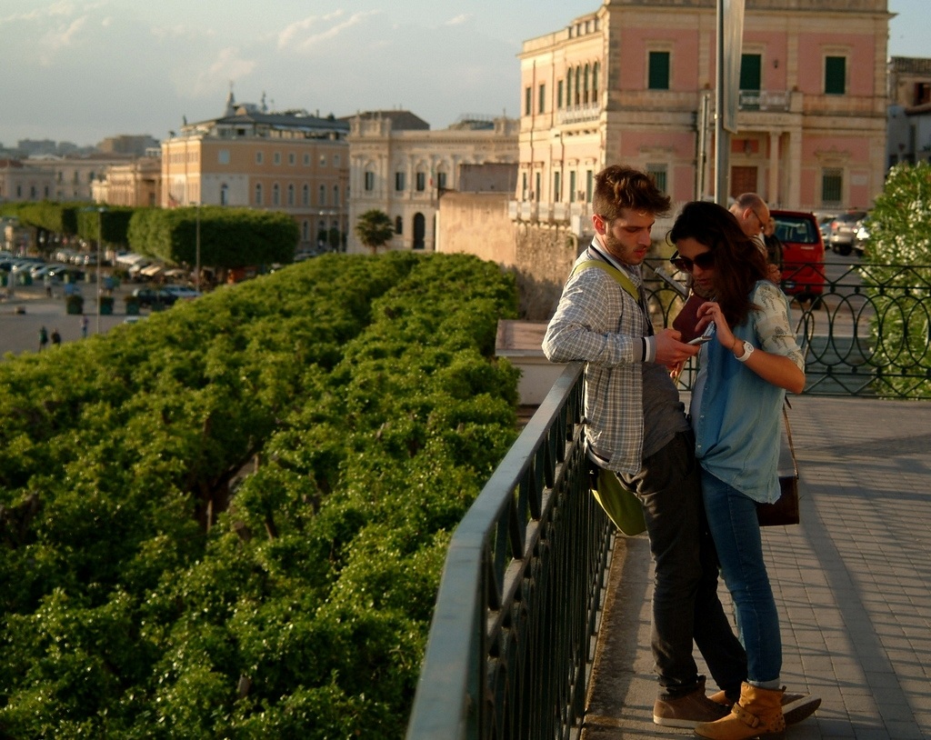 Il titolo lascerebbe intendere che tu conosca i due ragazzi ritratti, il che non significa necessariamente che sarebbe stato meglio fotografarli in posa, ma quanto meno studiare meglio l'inquadratura, in maniera da limitare gli elementi di disturbo (ad esempio la testa del signore sullo sfondo che si sovrappone) e definire, a livello narrativo, un rapporto gerarchico piú chiaro tra persone e contesto (in pratica lo scatto sembra dare quasi pari importanza ai soggetti ed allo scorcio paesaggistico, finendo per indebolire entrambi).