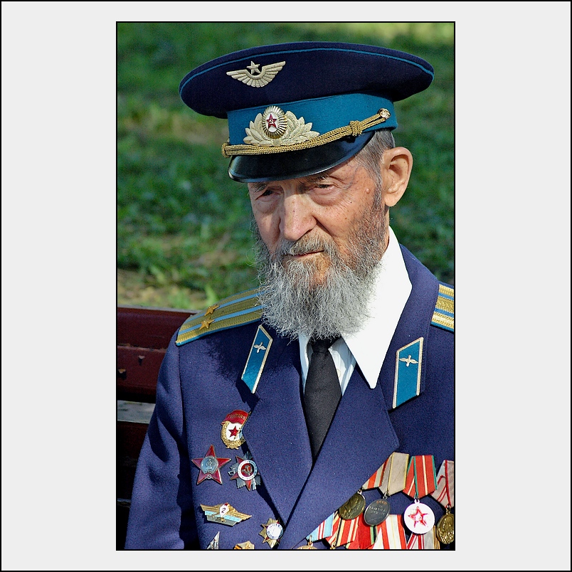 Prima dell'inizio della parata sono seduto su una panchina della piazza assieme ad uno di questi veterani ... cerco un dialogo, ma non è facile, Maryna che poteva essermi di aiuto come interprete non è ancora arrivata ...