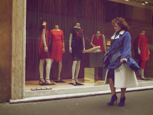 mi piace la composizione, come é stato fermato il gesto del soggetto: lo sguardo e il tacco sinistro, il dialogo con le gambe piegate del manichino.