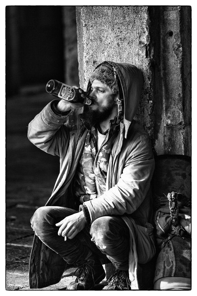 In una fotografia di questo genere, più simile al ritratto che alla street ( a mio modesto parere) anche i dettagli sono importanti; era meglio se evitavi di tagliare le scarpe (anche per questo, oltre che per conferire un contatto più diretto con il Soggetto, sono preferibili le focali corte).