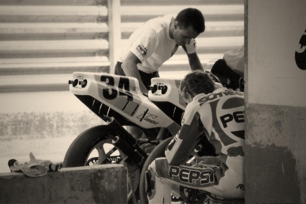 La sovrapposizione dei soggetti (umani e a due ruote) crea molta confusione visiva, accentuata anche dalla ridonanza di scritte e marchi vari. Il soggetto di spalle, che a quanto ho capito (scusate, non so niente di motociclismo) dovrebbe essere il protagonista dello scatto, é sfocato (il fuoco mi sembra che cada sulla coda della moto di mezzo) e inoltre poco significativo in quanto non se ne scorge il volto. La persona sullo sfondo attira maggiormente l'attenzione del soggetto di spalle, ma anch'essa risulta poco nitida.