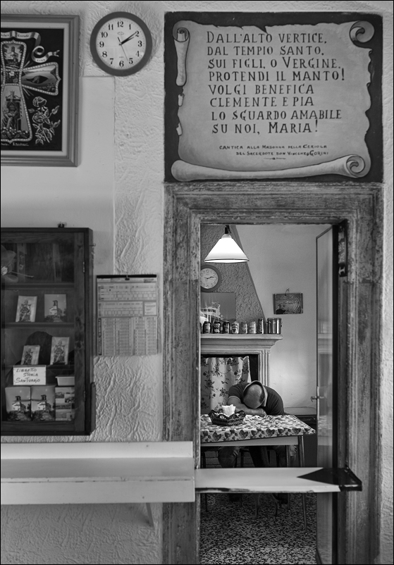 Perozzi(inizialmente avevo provato quel taglio,ma croppare tanto mi sembra sempre un ripiego poco etico;l'errore è stato in fase di scatto...bastava magari scambiare due parole e chiedere il permesso a scattare,l'uomo non dormiva,ma accarezzava il cagnetto sotto al tavolo...mi sono mangiato le dita a posteriori perchè appena entrato la scena era felliniana:moglie e marito seduti al tavolo in quella stanza d'altri tempi aspettando gli avventori in posa perfetta a braccia conserte...praticamente un'abitazione adibita a bar dove l'unico prodotto era il caffè che servono su quell'asse retrattile che vedi davanti)