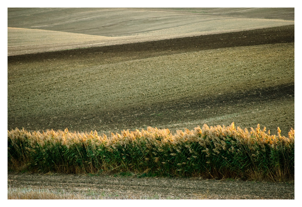 Il digradare dei campi arati sono chiusi da una siepe lambita dagli ultimi raggi del sole, in una bella e poetica immagine.