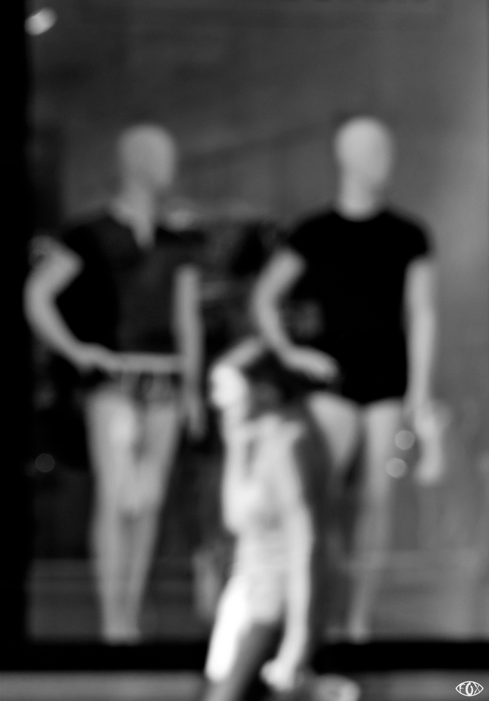 Alcuni elementi sono sicuramente interessanti...la simmetria delle figure umane dei manichini scure, la centralità e il movimento della persona umana chiara, figure immobili e figura mobile, il contrappunto tra una esistenza vera chiara e due scure finte...epperò magari viventi pure loro nel nostro immaginario, ma ferme e impassibili...insomma cose che io vedo ed interessanti.