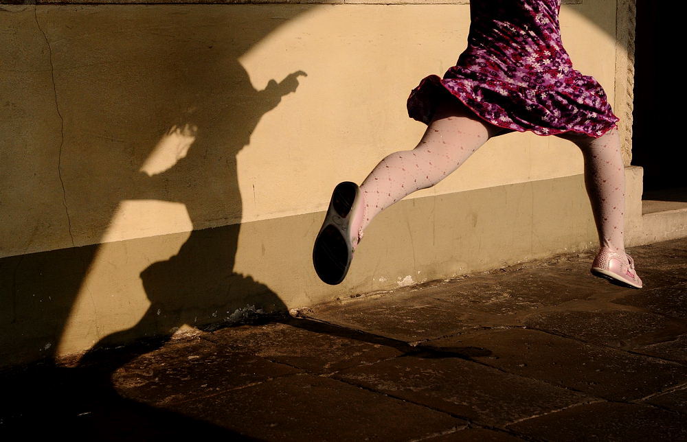 dicevo: che incredibile coincidenza...l'altro ieri, in giro con lo scooter, vedo una bambina saltare...la sua ombra lunga si sovrappone a quella mia...e mi è tornata a mente questa fotografia...giuro...ricordo che mi colpì molto pensando alla mia piccola che, senza quasi rendermene conto, sarebbe divenuta grande in un ....balzo...bè...a quel tempo Linda era davvero piccola...e la immaginavo vestita come questa tua più grandicella...naturalmente stiamo parlando di pochi anni fà...2/3 ? ma a queste età si passa da tenerle in braccio ad osservarle camminare da sole, vicino a noi, nelle passeggiate in centro....assorte nei loro pensieri colorati...