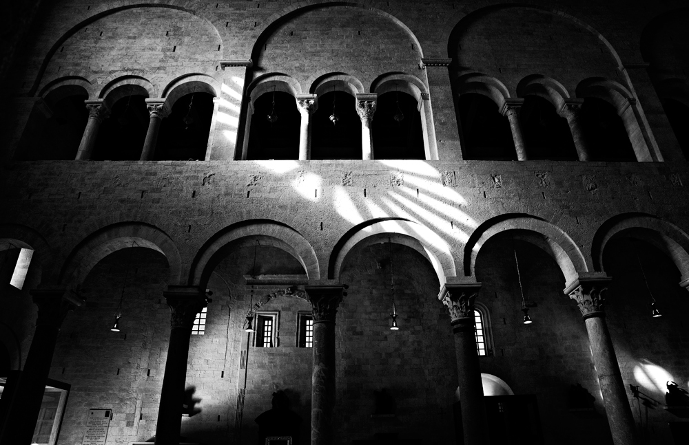 la cattedrale di Bari, molto impegnativa dal punto di vista della ripresa. solo con un decentrabile si sarebbe potuto evitare le linee cadenti. mi interessava la luce filtrata dal rosone centrale e soprattutto il diavoletto a destra. che poi è il vero motivo per cui ho postato questo divertissement.