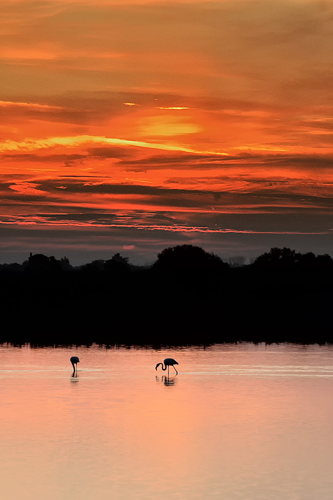 Si tratta di uno scatto paesaggistico/naturalistico che ha per protagonista i fenicotteri al tramonto.