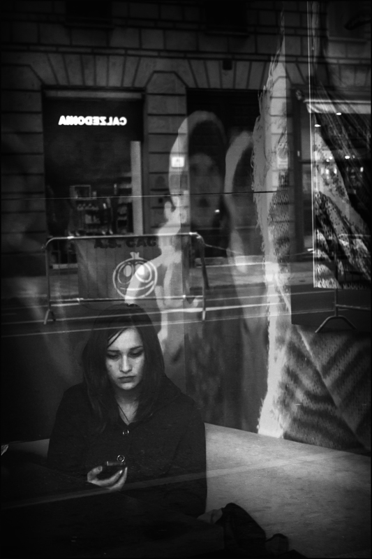 A me, piace molto. Mi piace il duplice racconto che vive i questa immagine. La ragazza vera e l'intorno "riflesso" due tracce che si sovrappongono e tra loro interagiscono.