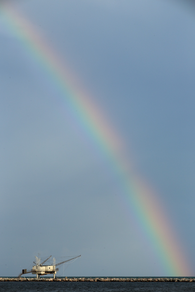Composizione perfetta ed efficace, con l'arcobaleno che disegna un bel semicerchio da angolo ad angolo e con il trabocco in pozione defilata in basso, ad esaltare la maestosità dello spettacolo nel cielo.