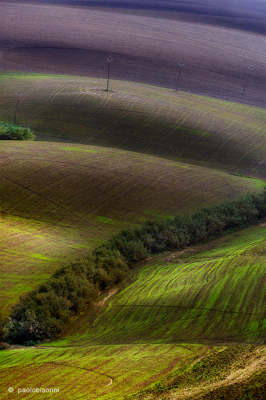 Ottima Paolo, immagine dalla valenza prettamente grafica che si avvale del bellissimo digradare dei colori che passano dal verde al lilla e poi all'indaco. Il il tutto esaltato dalla piacevole alternanza di ombre e luci che fa assumere alle colline un aspetto tridimensionale. Una foto davvero eccellente... come nel tuo stile Ok!