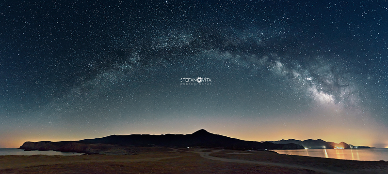 sempre molto spettacolari queste visioni della via lattea ad arco. il paesaggio minimale accentua i caratteri di spettacolarità del cielo.