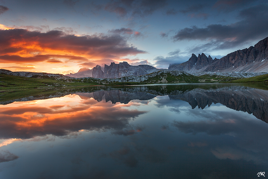Riguardo la pendenza ho già spiegato in precedenza, la foto non pende, ho controllato più volte con la bolla....sono le rive del laghetto che ingannano, basta guardare le cime e il loro riflesso per capire che sono perfettamente simmetriche.