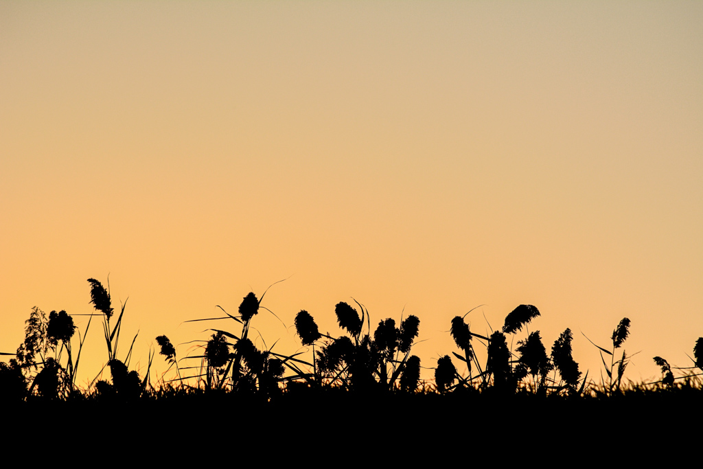 Sapiente scelta quella di mettere in basso la vegetazione silhouettata facendogli occupare solo il terzo inferiore del fotogramma dando così ampio respiro a quel bel cielo caldo e uniforme del tramonto.