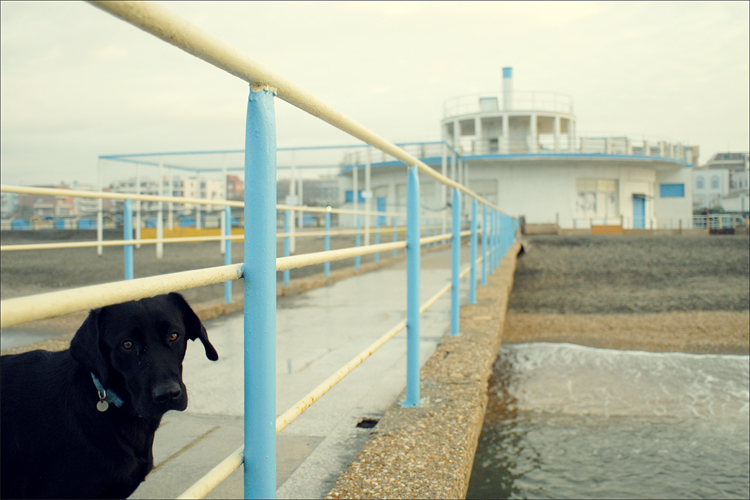 Bella accoppiata di elementi: cane, mare, stabilimento con particolari azzurri e non ultimo anche il cinturino del guinzaglio.