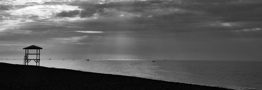 Il bianco e nero è un po grigioso, a parte la sabbia quasi nera e la porzione di cielo bianca, per il taglio ognuno sceglie quello che ritiene opportuno, per la composizione devo dire che non è male, anche se gli elementi sono tutti concentrati nella metà di sinistra, ho letto da qualche parte che se la foto pesa da una parte "cade"....ma non è sempre vero.