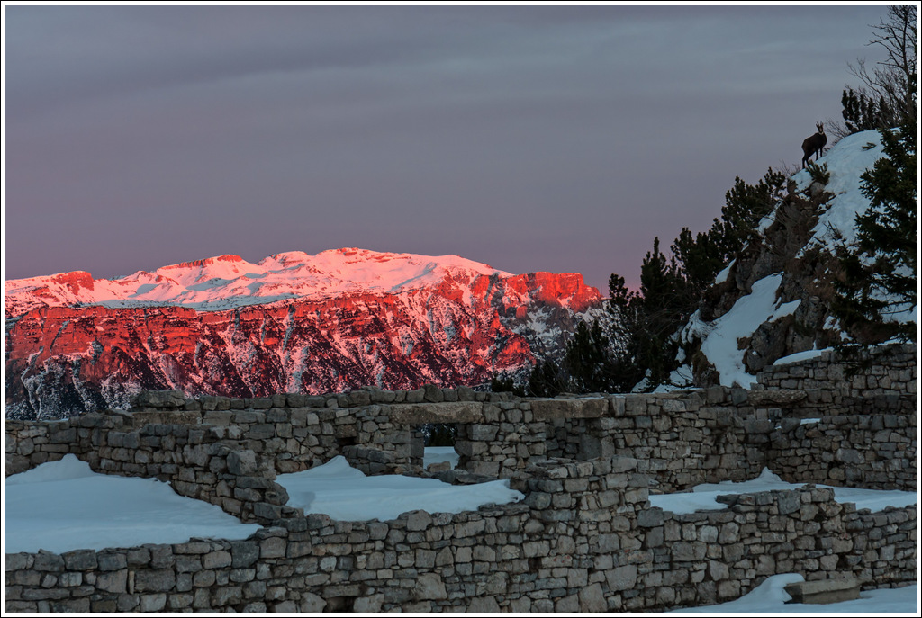 Solo io e lui a goderci i pochi secondi che ci separavano dal buio; in primo piano i ruderi del vecchio ospedale militare sul monte Zugna e sullo sfondo, con la Vallarsa di mezzo, il Pasubio infuocato dal tramonto con la zona sacra dei Denti... il "Lui" è in alto a destra ed ogni tanto mi fischiava per attirare l'attenzione.