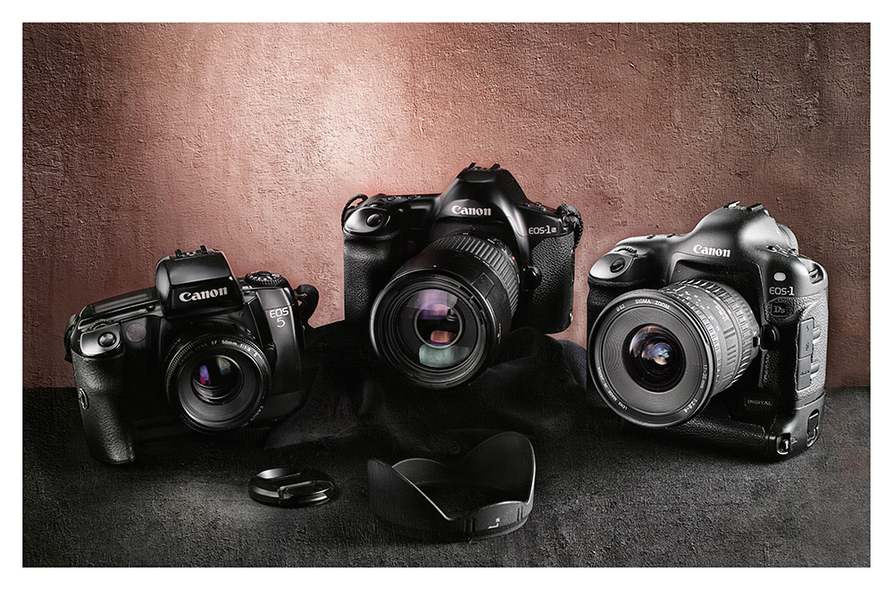 In questo caso penso che sarebbe stato necessario una gestione della luce più complessa per ottenere la stessa resa della Canon 1 Ds, riducendo il riflesso sulla lente della fotocamera centrale e sollevando un po' la EOS 5.