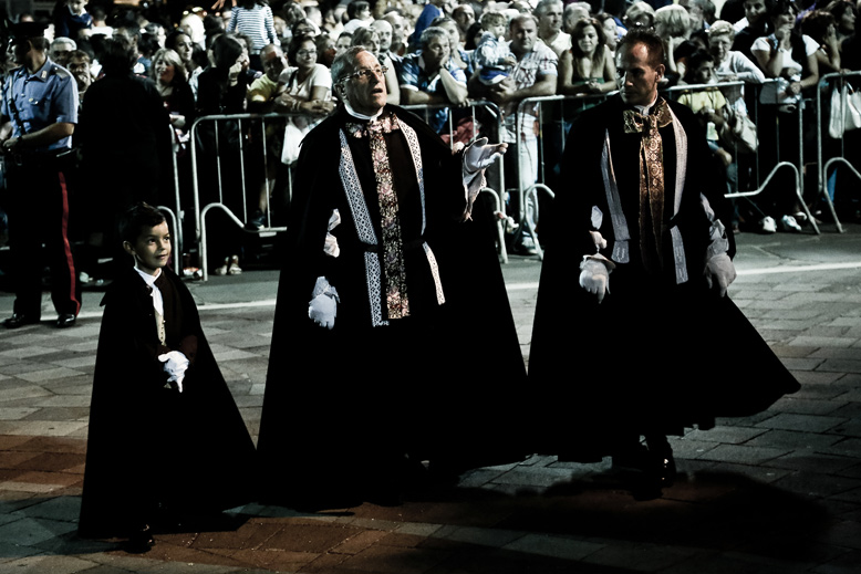 Il bianco e nero "tragico" che ho usato, voleva evidenziare la sacralità di cui è ammantata la festa votiva. Ho postato anche foto a colori ma comunque con la stessa atmosfera. Lo so che questo non depone a favore della pulizia della foto e dei suoi dettagli.